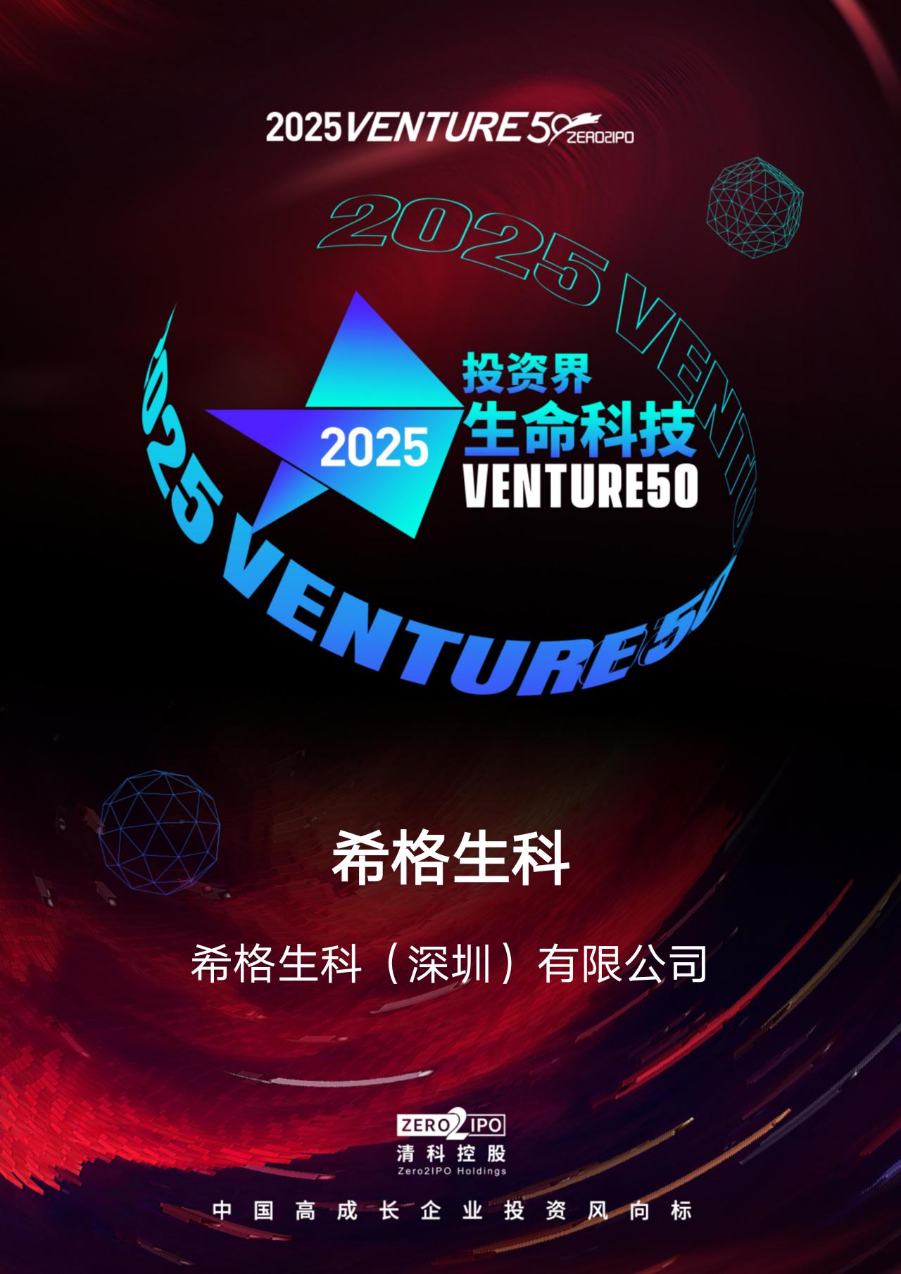 12月4日,由清科控股(1945.HK)、投资界联合发起的2025 VENTURE 50(以下简称V50)评选结果正式揭晓。希格生科凭借在生命科技领域的创新实践与快速成长,成功入选这一中国高成长企业投资风向标榜单,荣登「生命科技50」榜单。